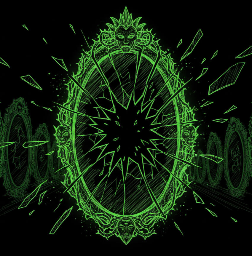 (The Evil Kween speaks in a thousand voices and reflections in the Hall of Mirrors)Look around you, fool... see yourself reflected endlessly, but.. is it even you?No one can be the fairest when you're all identical!